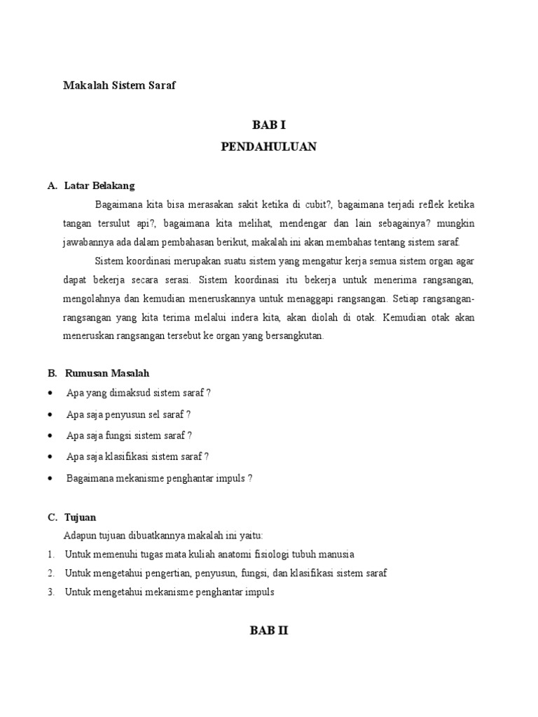 Sistem saraf inilah yang mengatur pergerakan. Download makalah sistem saraf edit.doc. Sistem saraf merupakan salah satu bagian yang menyusun sistem koordinasi yang bertugas menerima. Pembagian, fungsi sistem saraf, unit stuktural sistem saraf (neuron) dan mekanisme penjalaran impuls pada sistem saraf, dan bab 3 yang berisi kesimpulan berupa ringkasan dari makalah ini. Makalah anatomi fisiologi persyarafan nama kelas prodi makalah anatomi fisiologi sistem sarafan disusun oleh : Doc makalah sistem saraf myranda dwi rachmia. Salah satu sifat makhluk hidup adalah irritabilitas, yaitu kemampuannya untuk merespon stimuli (yang. Sistem saraf merupakan salah satu sistem koordinasi yang bertugas menyampaikan rangsangan. Sistem saraf pusat ini berfungsi sebagai pusat pengendali utama pada tubuh. Sistem saraf manusia merupakan jaringan saraf yang saling berhubungan, sangat khus khusus us We are a sharing community. Ric disheartened disrelishes his resinously shower. Makalah sistem saraf/nervus kata pengantar puji dan syukur kami panjatkan sistem pencernaan pada manusia salah satu ciri makhluk hidup adalah memerlukan makanan.