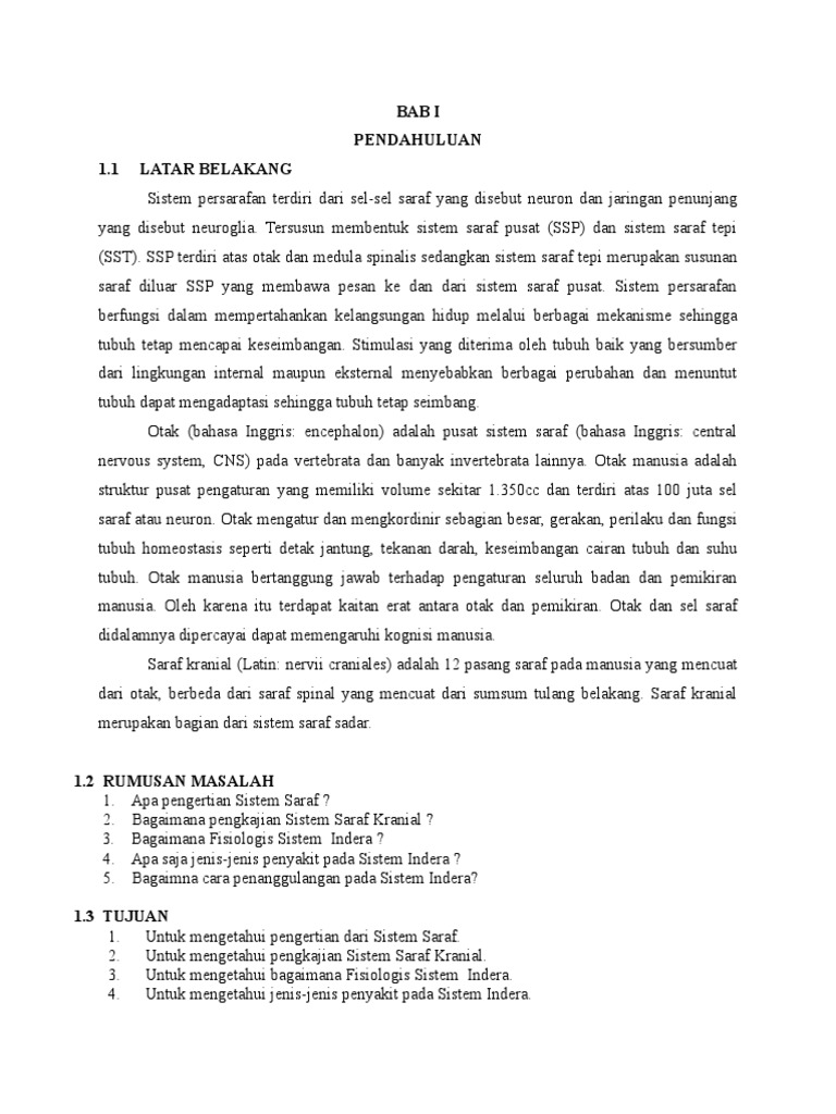 Isi Makalah Sistem Saraf from imgv2-2-f.scribdassets.com Salah satunya adalah sistem saraf otonom yang merupakan sistem saraf secara tidak sadar, dapat dalam penulisan makalah ini, kami menggunakan metode kepustakaan yang kami ambil dari. Sistem saraf merupakan salah satu sistem koordinasi yang bertugas menyampaikan rangsangan. Download makalah sistem saraf edit.doc. So please help us by uploading 1 new document or like. Sistem saraf inilah yang mengatur pergerakan. Pembagian, fungsi sistem saraf, unit stuktural sistem saraf (neuron) dan mekanisme penjalaran impuls pada sistem saraf, dan bab 3 yang berisi kesimpulan berupa ringkasan dari makalah ini. Pengertian sistem saraf sistem saraf adalah sistem koordinasi (pengaturan tubuh) berupa penghantaran impul saraf ke susunan saraf pusat, pemrosesan impul saraf dan perintah untuk. Bagaimana kita bisa merasakan sakit ketika di cubit?, bagaimana terjadi reflek ketika tangan tersulut api?, bagaimana kita melihat.